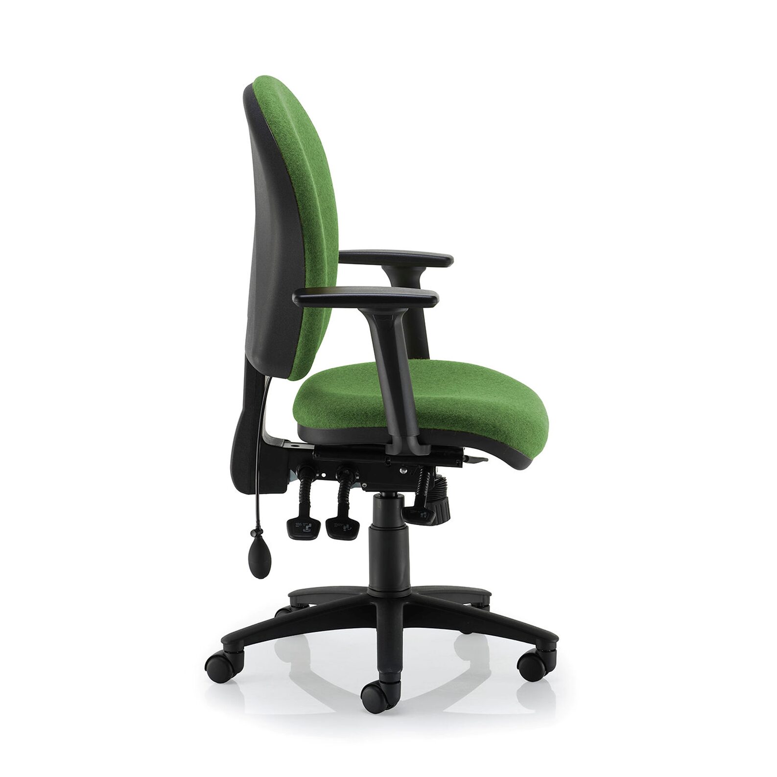 High back sprite operator chair with inflatable lumbar support, manual back height adjustment, gas seat height adjustment and back angle adjustment.
